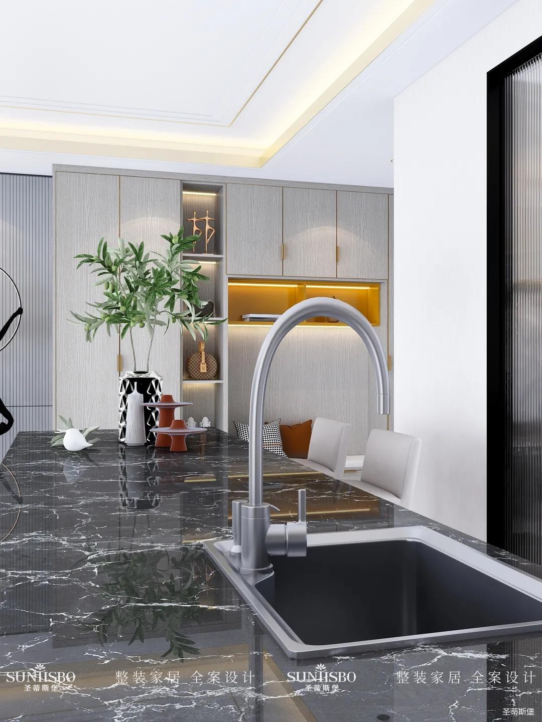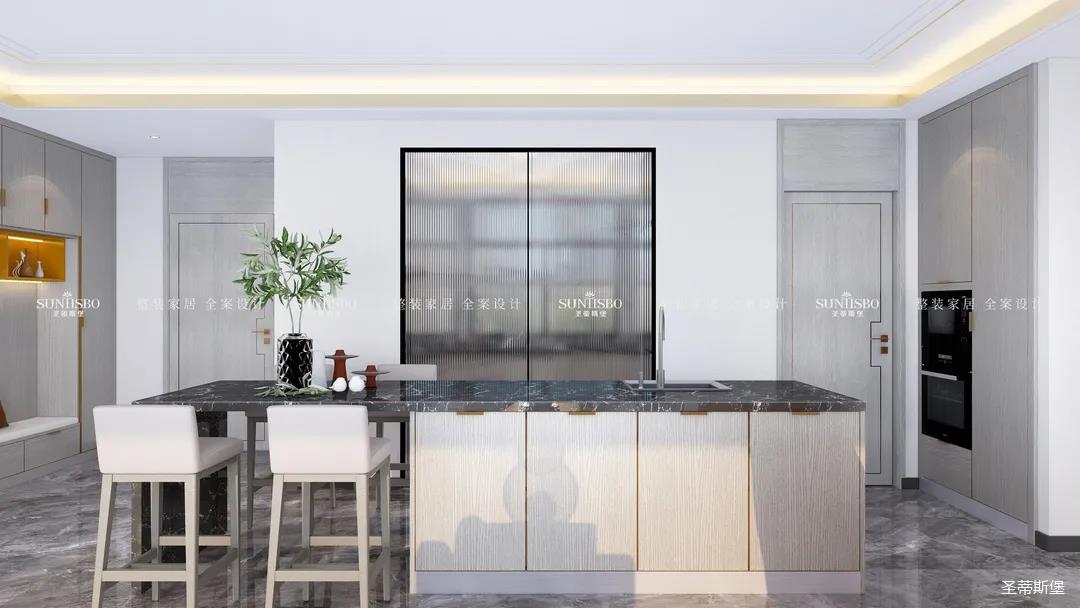 设计师以厨房&西厨区为布局的中轴,打开左右空间,延伸出厨房动线功能区,增加西厨区域,有效延伸空间。设计师打造了下午茶专属的中岛台,中岛台与客厅串连,方便屋主随时分享美食乐趣。