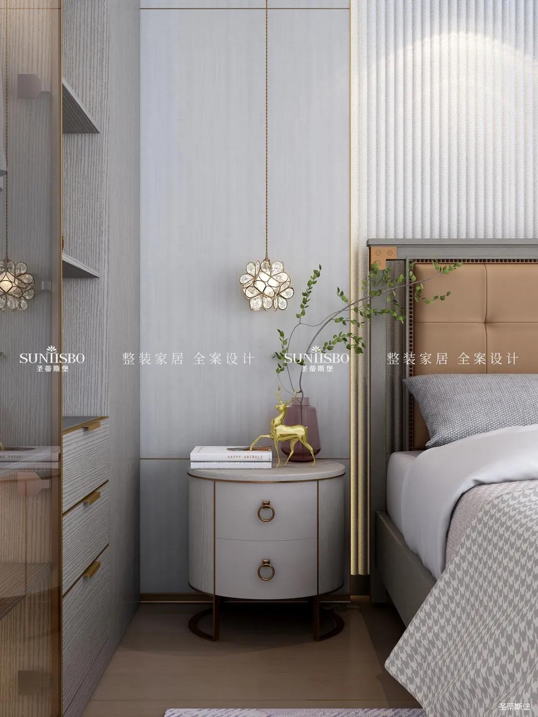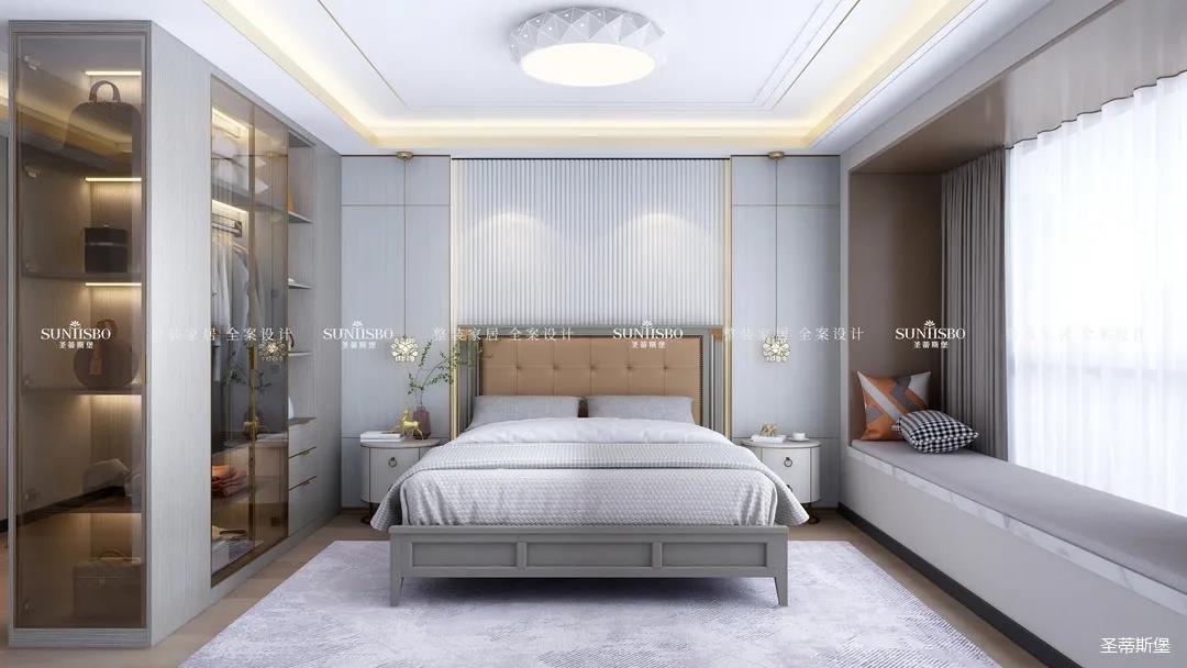 精于思而展于型,主卧将浮华的装饰剔除,装饰线连接各个区域,强调了空间的节奏与韵律。运用时尚灰大面积展现着高级感,让不同色彩的家具结合,营造出与众不同的韵感与雅致,给人良好的睡眠体验。