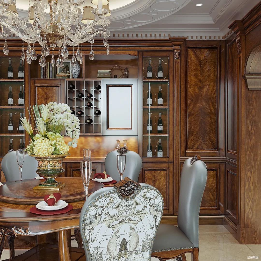 女业主是留美归来,非常喜欢美式用餐氛围,设计师以怀旧雅致作为室内基调,整体定制柜与护墙,都透着美式的自然怀旧,即使褪去家具软装,仅存留硬体结构,仍透散着优雅纯净的美式韵味。